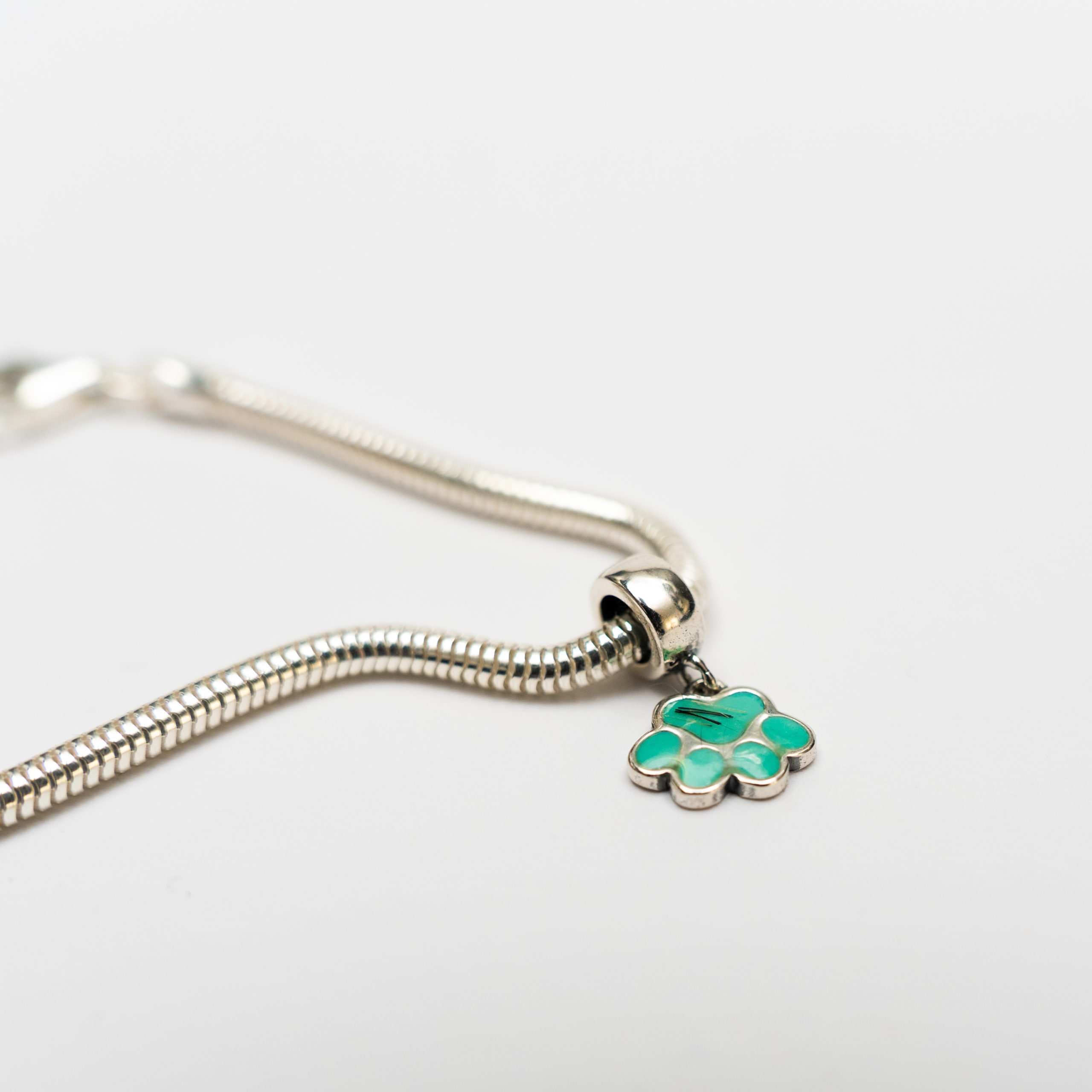 Charm de patita colgante en plata de primera ley, tiene dos caras y se puede poner, pelito o cenizas de cremación